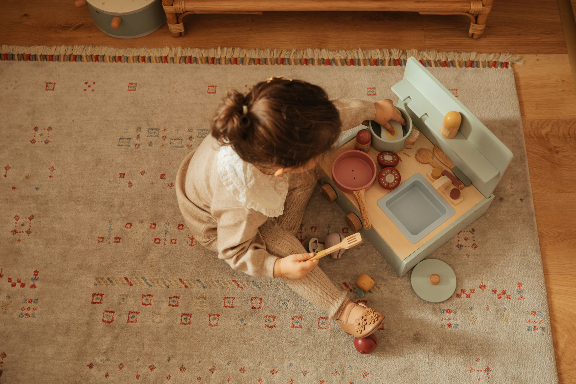 Settets leveres med et omfattende utvalg av tilbehør, inkludert panne, gryte med lokk, kjøkkenredskaper, tallerkener, bestikk, kopper samt salt- og pepperbøsser. Det gir mulighet for mange timer med kreativ rollelek.